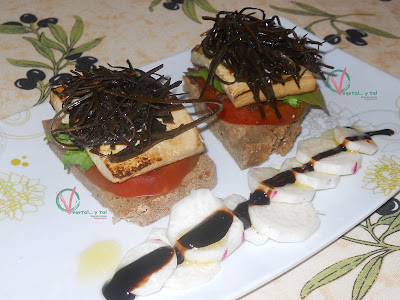 - Hacer los montaditos poniendo el pan tostado y, consecutivamente, una rodaja de tomate, la cebolla frita crujiente, las hojas de espinacas, el tofu a la plancha y las algas arame aliñadas. Acompañar con rabanitos cortados en rodajas y aliñados con sal, AOVE aromatizado y salsa de vinagre de módena y naranja.