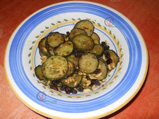 En el aliño final no precisa de aceite, ya que lleva el que han absorbido los calabacines en la fritura. La frescura que le proporciona la menta es realmente la gran aportación de esta ensalada, que nos refrescará y proporcionará alimento con las pasas y los piñones. Estos (pasas y piñones) en la receta original se ponen en crudo, pero yo prefiero pasarlos por la sartén para sacarles más sabor (también se pueden pasar por la sartén los piñones, pero las pasas no, al gusto).
